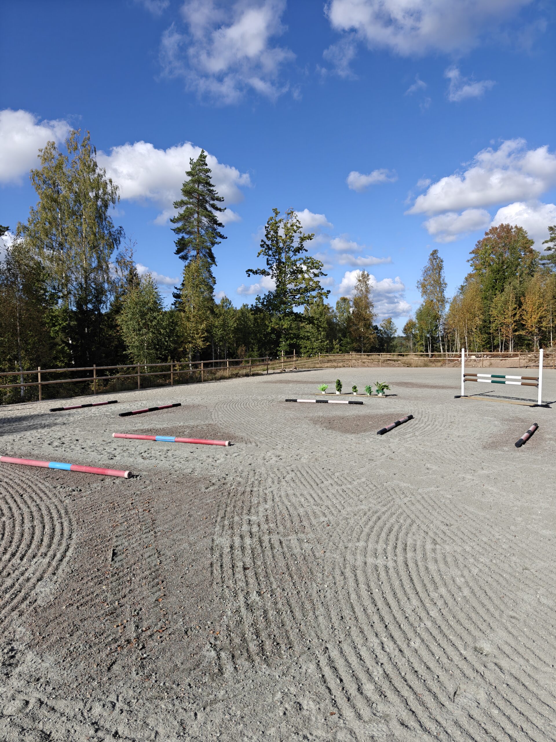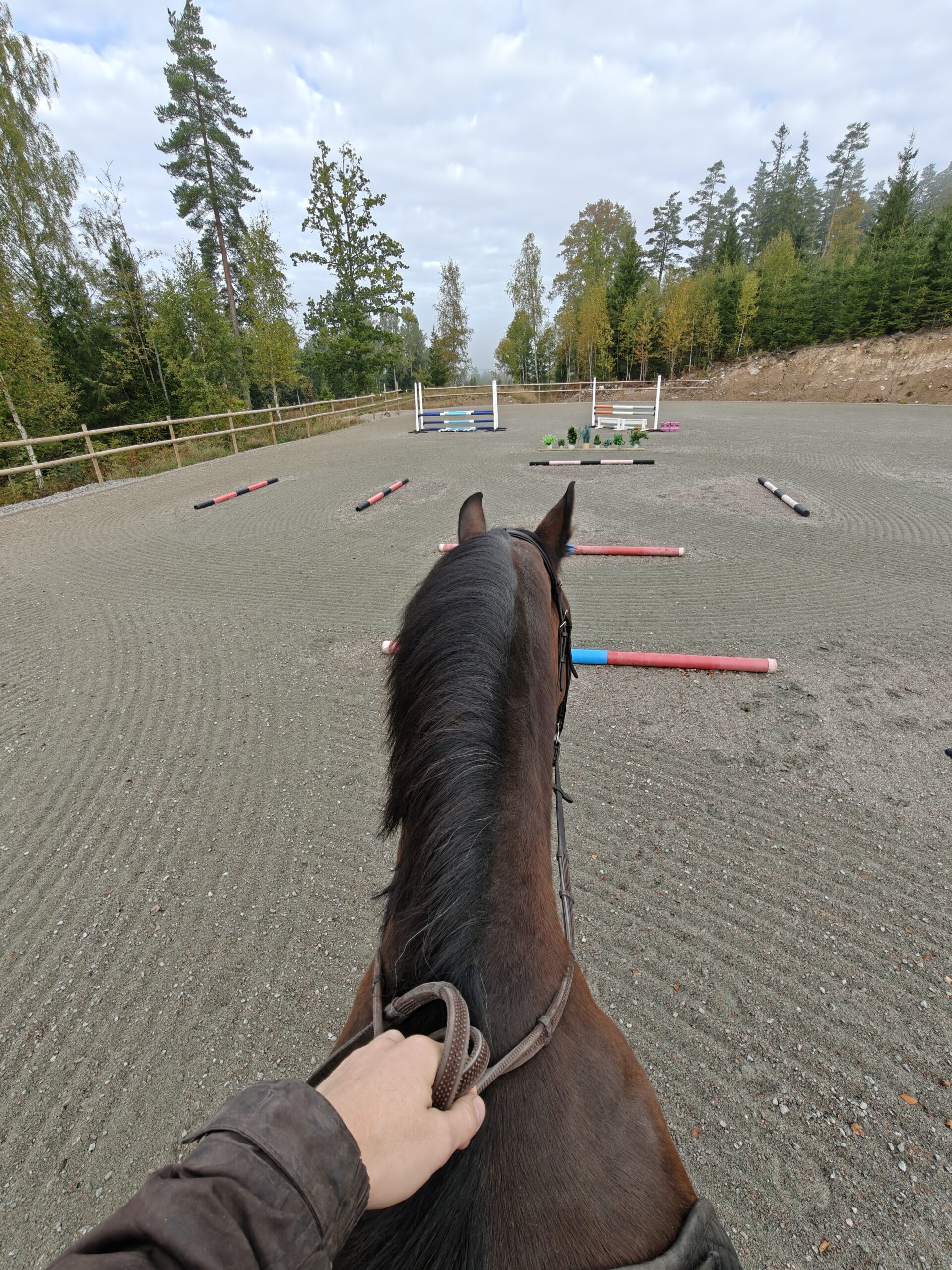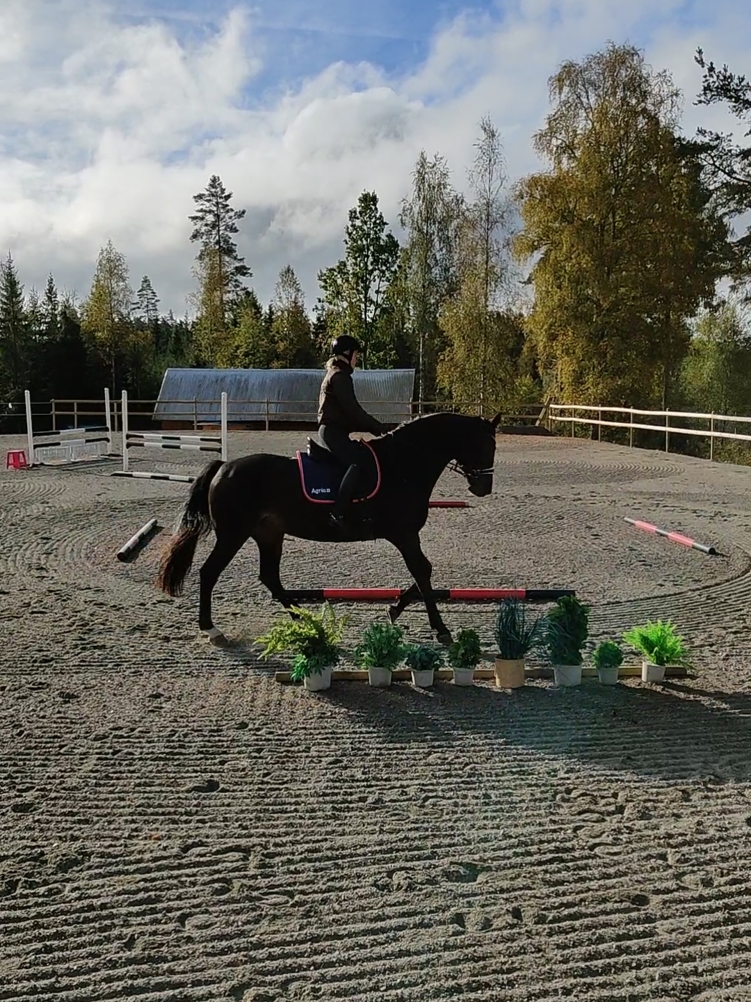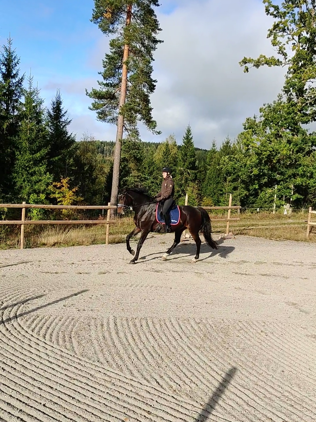 Ida känns bättre & bättre för varje vecka som går. Våra pass är ”enkla”. Det är fokus på att hon ska spåra och gå i balans. Jag rider volter, några övergångar och förvänd galopp. Ibland rider jag in i några andra lösgörande övningar.