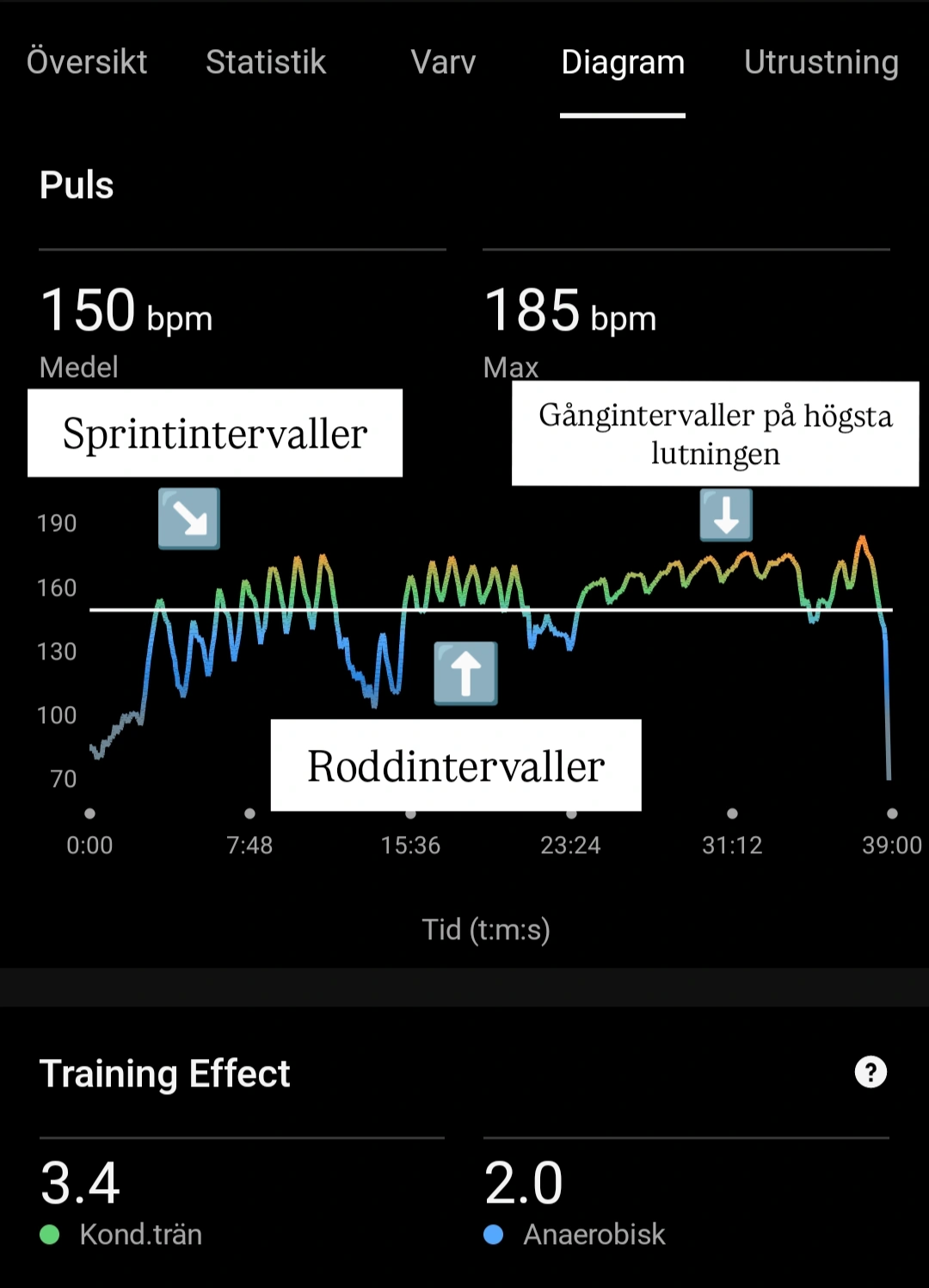 Igår började jag med korta sprintintervaller på löpbandet. 6 stycken. Sedan något längre intervaller på roddmaskinen, 6 stycken. Sedan avslutade jag med ytterligare 6 stycken intervaller på löpbandet. Den här gången gick jag på högsta lutningen. Då valde jag att köra 90 sekunders arbete, 20 sekunders vila.