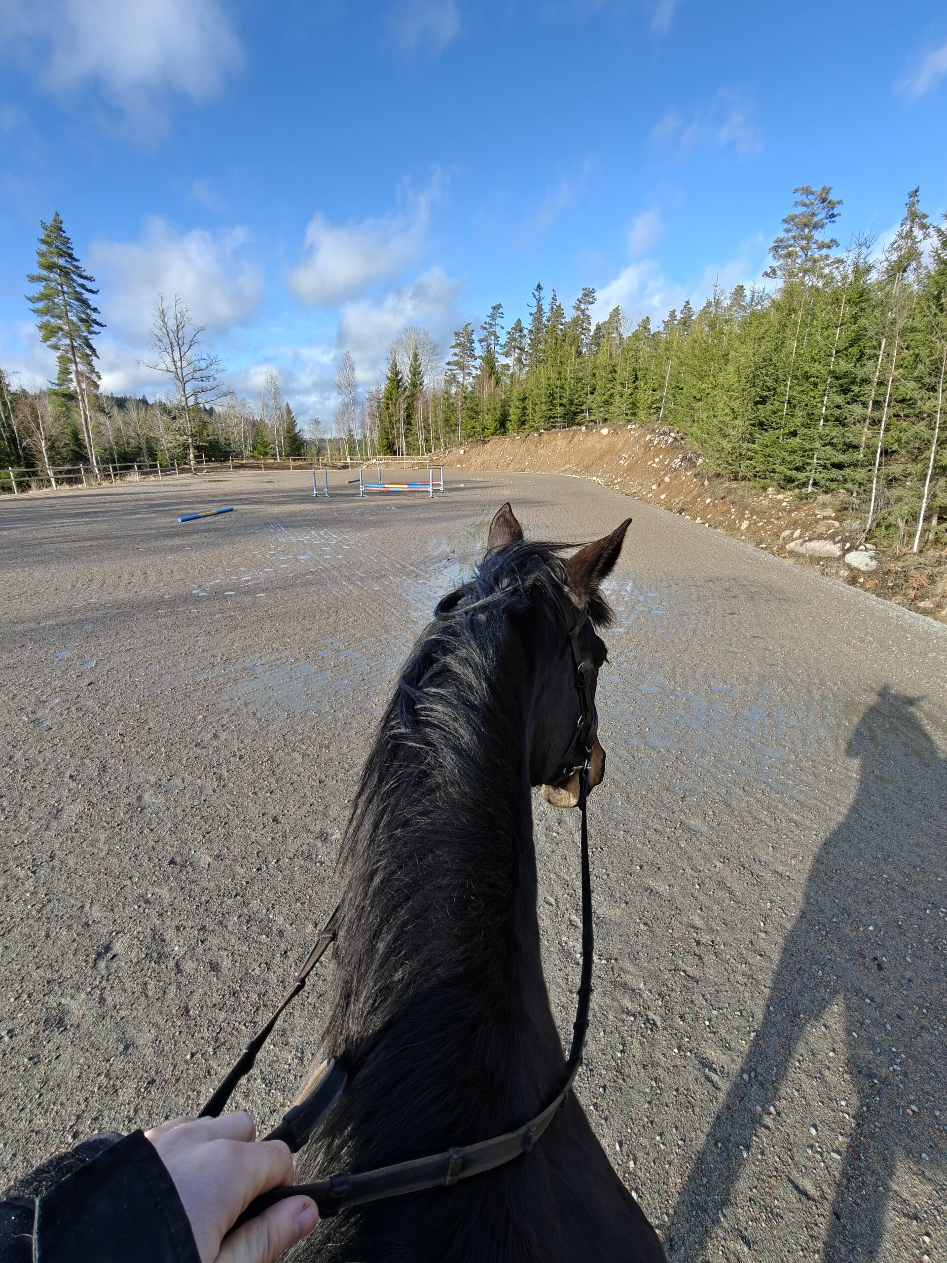 Dagens ridpass slutade på 2,5 km, varav endast 1 kilometer av dessa var på fältet. Vi har inte ridit något på fälten i år, så hästarna är ovana. Det räckte gott att nöja sig innan de blev svettiga. Viktigt att ta de lugnt på nya underlag.