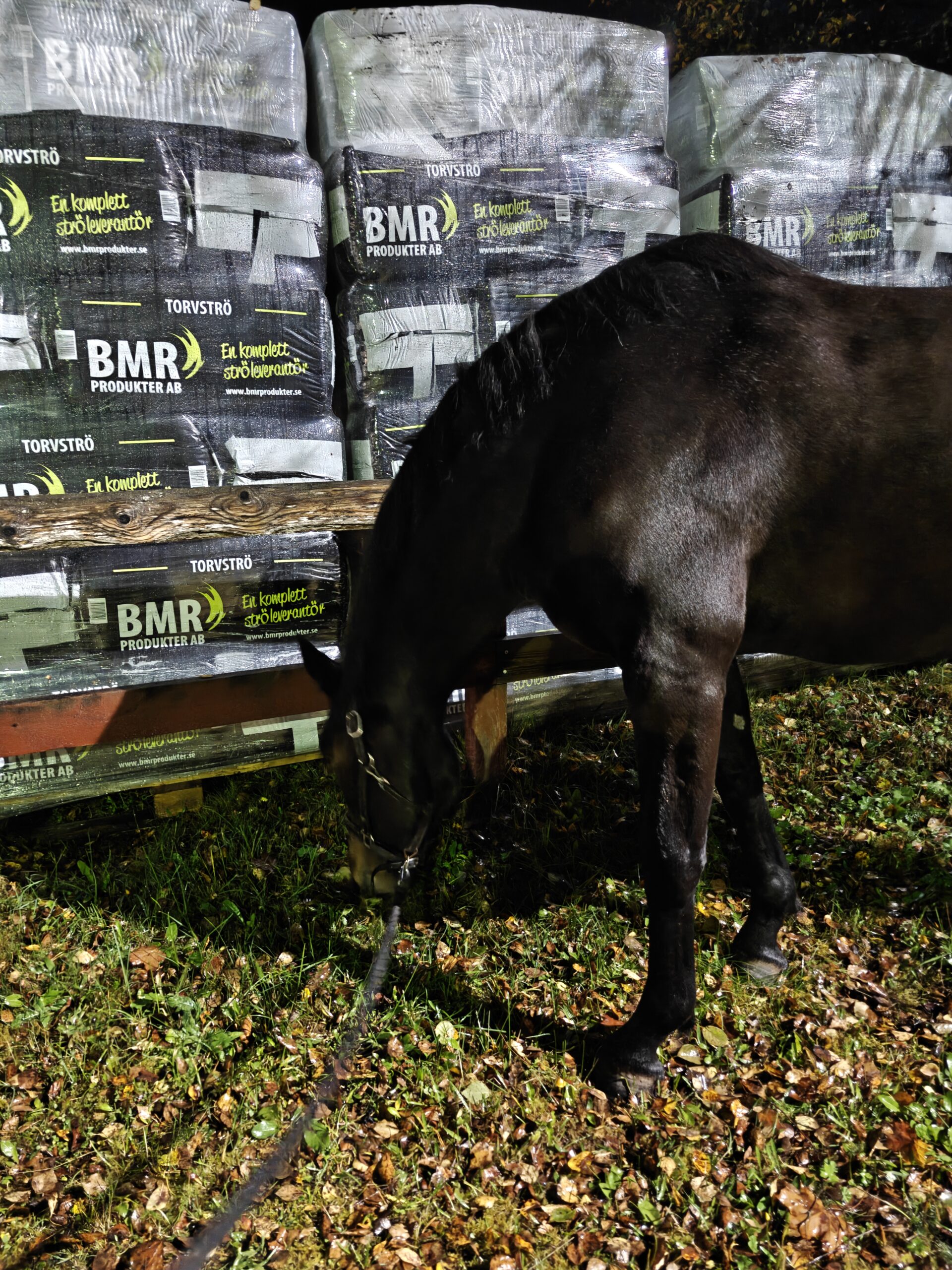 Jag var uppe och promenerade samt betade henne inatt. Bilen som delar ut tidningar & paket kom vid 02:40-tiden. Den personen måste ju trott att jag var sjuk i huvudet. Ute och promenerar med min häst mitt i natten liksom, haha.