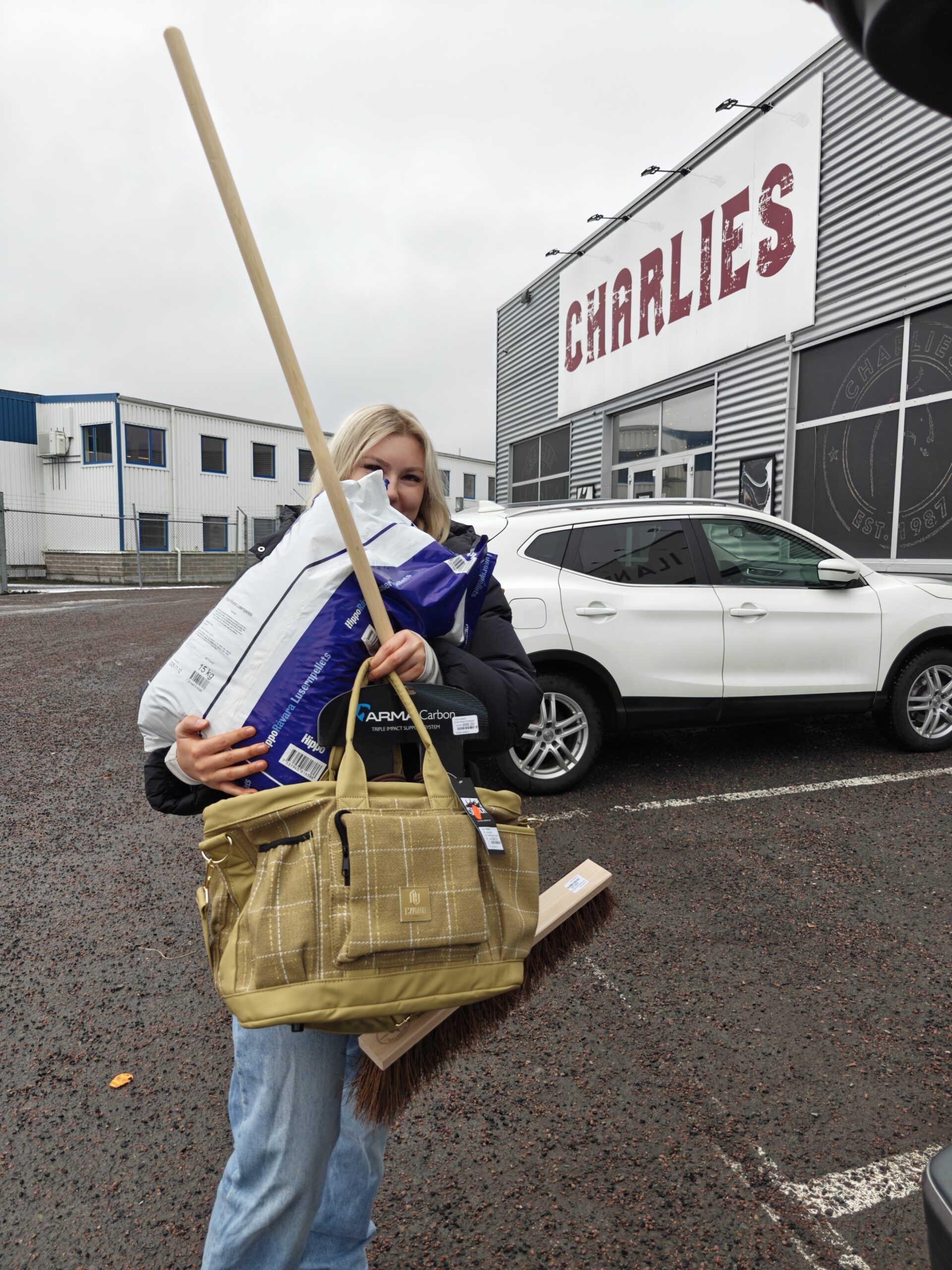 Började min dag med att släppa ut hästarna, gå med Idun och sedan göra stallet. Efter det bar det iväg mot Jönköping. Ville kontrollera att stoppningen på min sadel fortfarande var ok, och det var den. Köpte nya benskydd, ryktväska, en fodersäck och ny stallkvast när jag ändå var på Charlies. Men jag borde kanske köpt ett par nya stigläder med… Glömde det. De slits så snabbt nu för tiden!