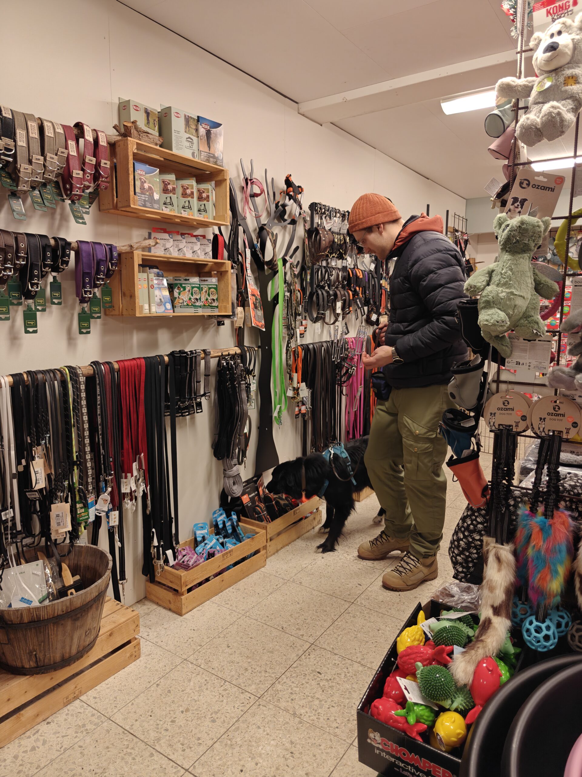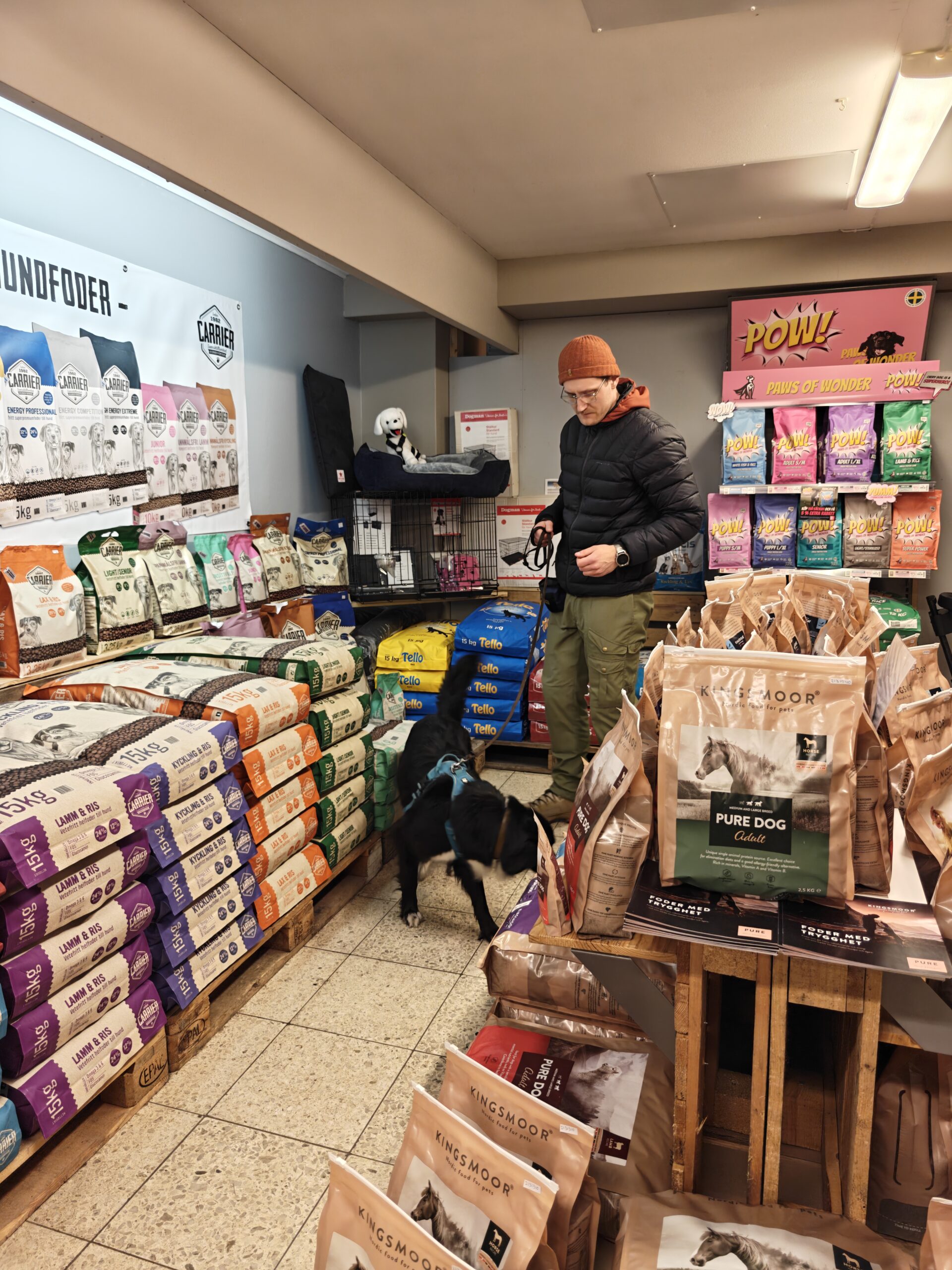Efter lite vila så var det dags att gå upp till butiken, och inte vilken butik som helst, utan en hundbutik! Fullproppat med leksaker, godis & mat. En svår miljö, men jag tror faktiskt inte att den störde Idun så mycket. Däremot så märktes det att hon var trött efter källarsöket, och så hade hon ju väntat i bur däremellan samtidigt som det är andra hundar och människor i rörelse. I butiken hittade hon två av gömmorna, men sedan orkade hon inte mer. Hon luktade idogt, men orkade inte riktigt bena ut doften och kom aldrig till en markering.