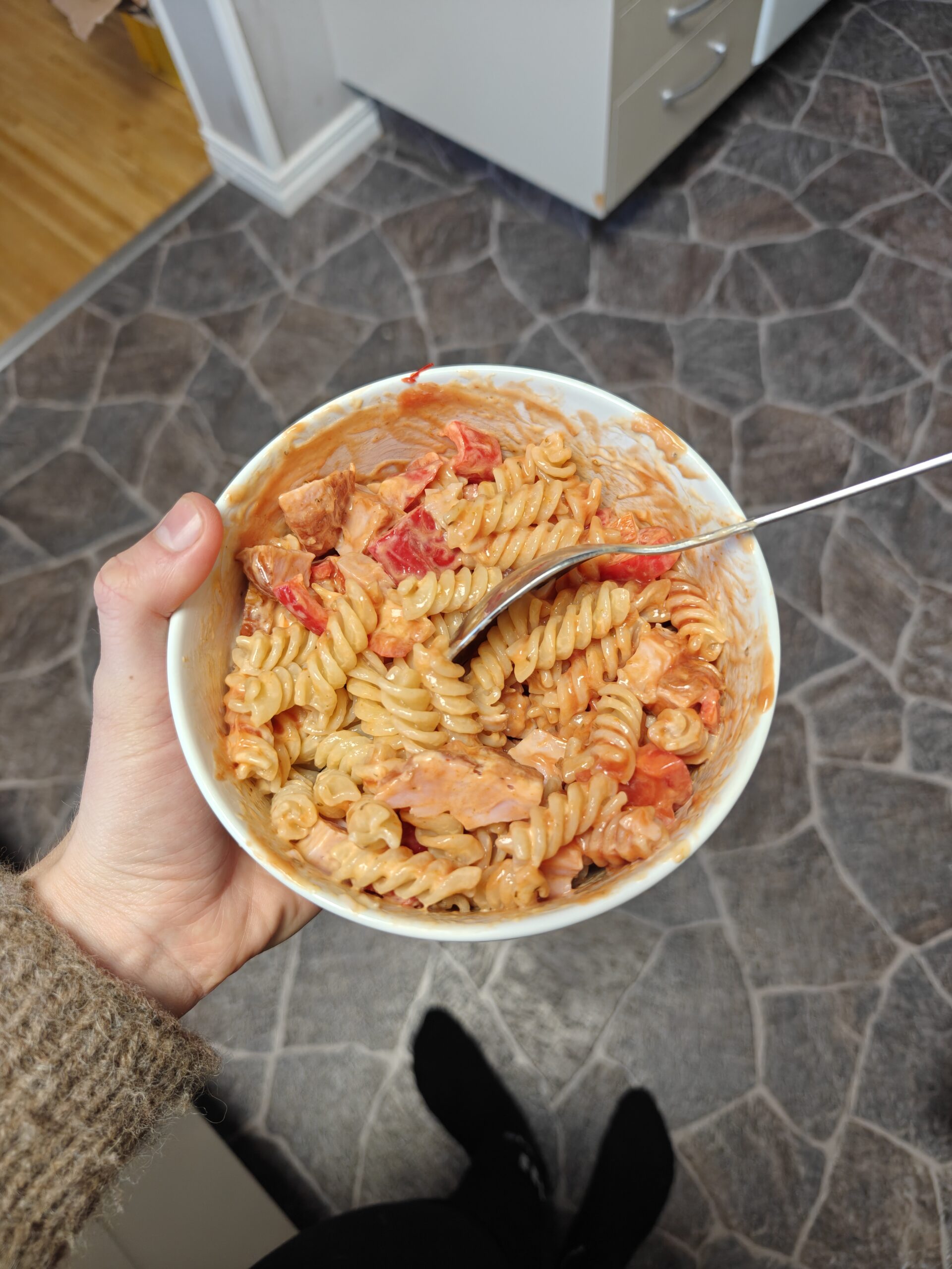 Sedan hem. Åt lunch. Det blev pasta med lite smaksatt creme fraiche, kassler & paprika. Idag tänker jag på att inte äta för mycket grönsaker, åtminstone ingen större mängder råa. Jag vill äta ganska fiberfattig & lättsmält mat för att känna mig lätt i morgon, jag vill inte ha en massa i magen. Undviker även större mängder fett.