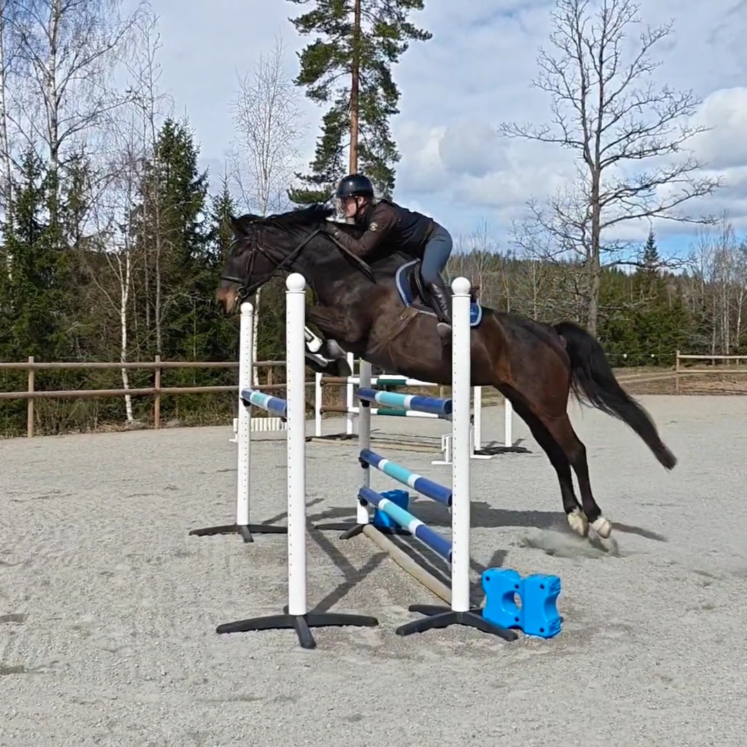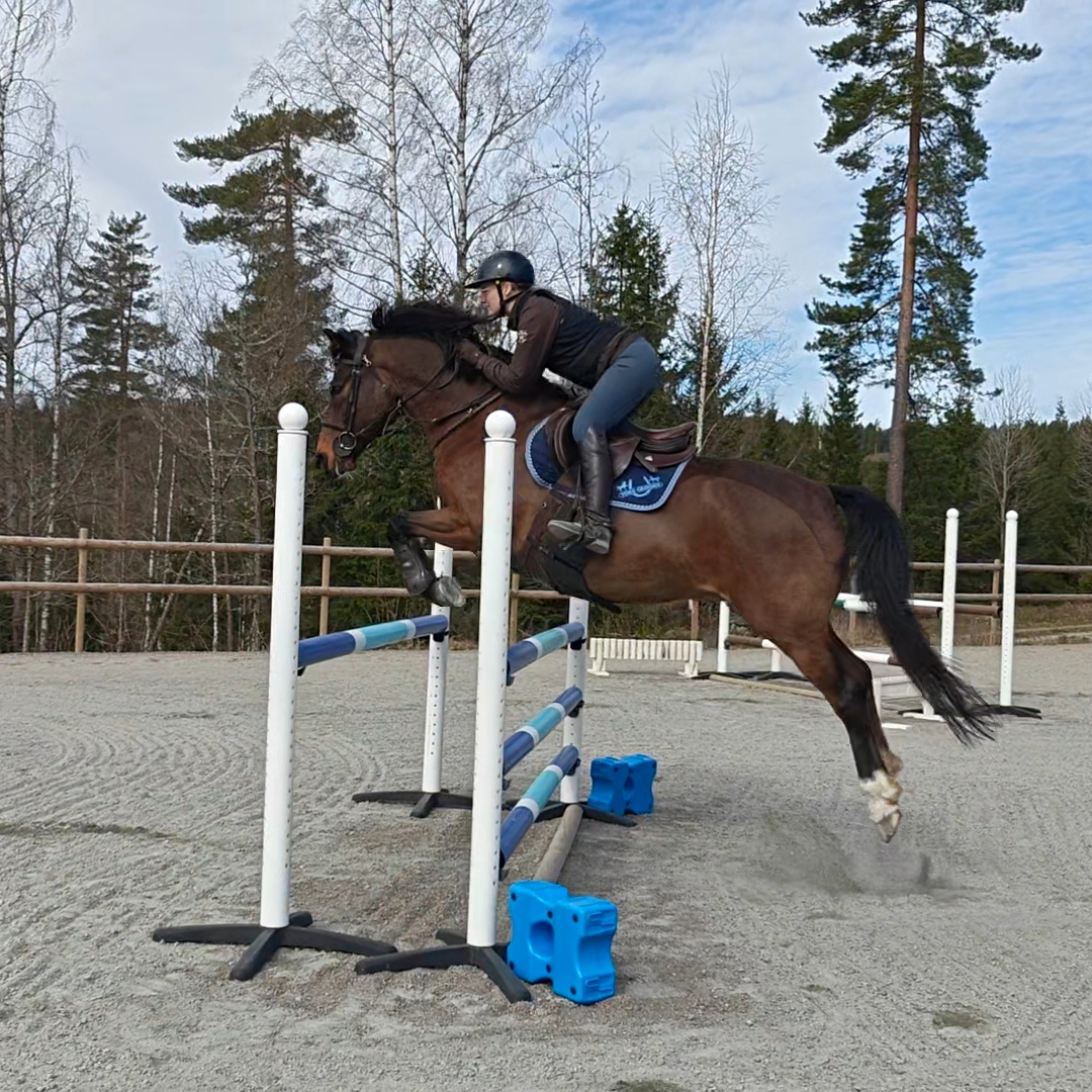 Palle: Palle var först ut under dagens hoppning. Andra gången som jag hoppar honom i år. Jag hoppade en liten bana på båda hästarna. Efter uppvärmningen så tog jag banan på ca 90-105 cm. Kändes bra. Trots att jag inte har hoppat honom på länge så kände jag ändå att jag snabbt kunde ställa om till hans galopp. Tog banan i ett lite lägre tempo första rundan. Jag vill inte sätta för mycket galopp i Palle från början. Han kan tappa balansen och lite rusa mot hinderna om man sätter upp en galopp som är större än vad han orkar bära upp. Eftersom att han i grunden är en ganska taggad häst på hinderna så kan det vara svårt att bryta om han väl har börjat att springa. Så jag börjar hellre i ett lite lägre tempo, och sedan om jag känner att bärigheten är tillräckligt bra så rider jag ut galoppen lite mer. Allt kändes väldigt bra, så när vi tog banan en andra gång på lite högre höjd (ca 110cm) så växlade jag upp lite till, han var ändå kvar i balans och väntade fint på hinderna. Mycket bra!